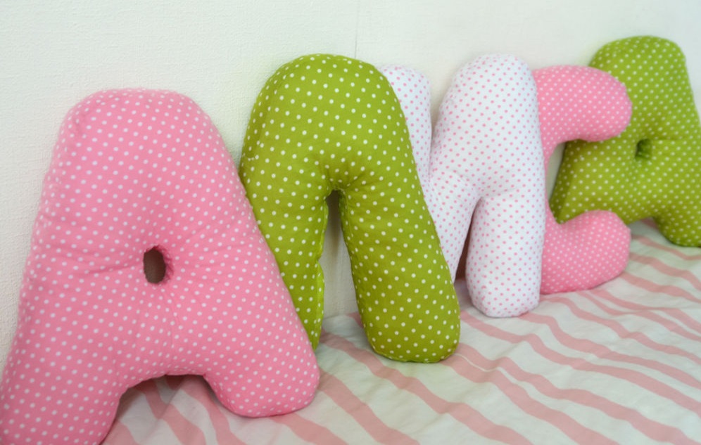 Интересная идея украсить интерьер детской спальни или комнаты для пары своими руками заключается в создании подушек в виде букв и подушек имена. Такие изделия понравятся не только детям, но и взрослым. Все зависит от ткани, насколько она будет красочной и подходить под стилистику интерьера комнаты.