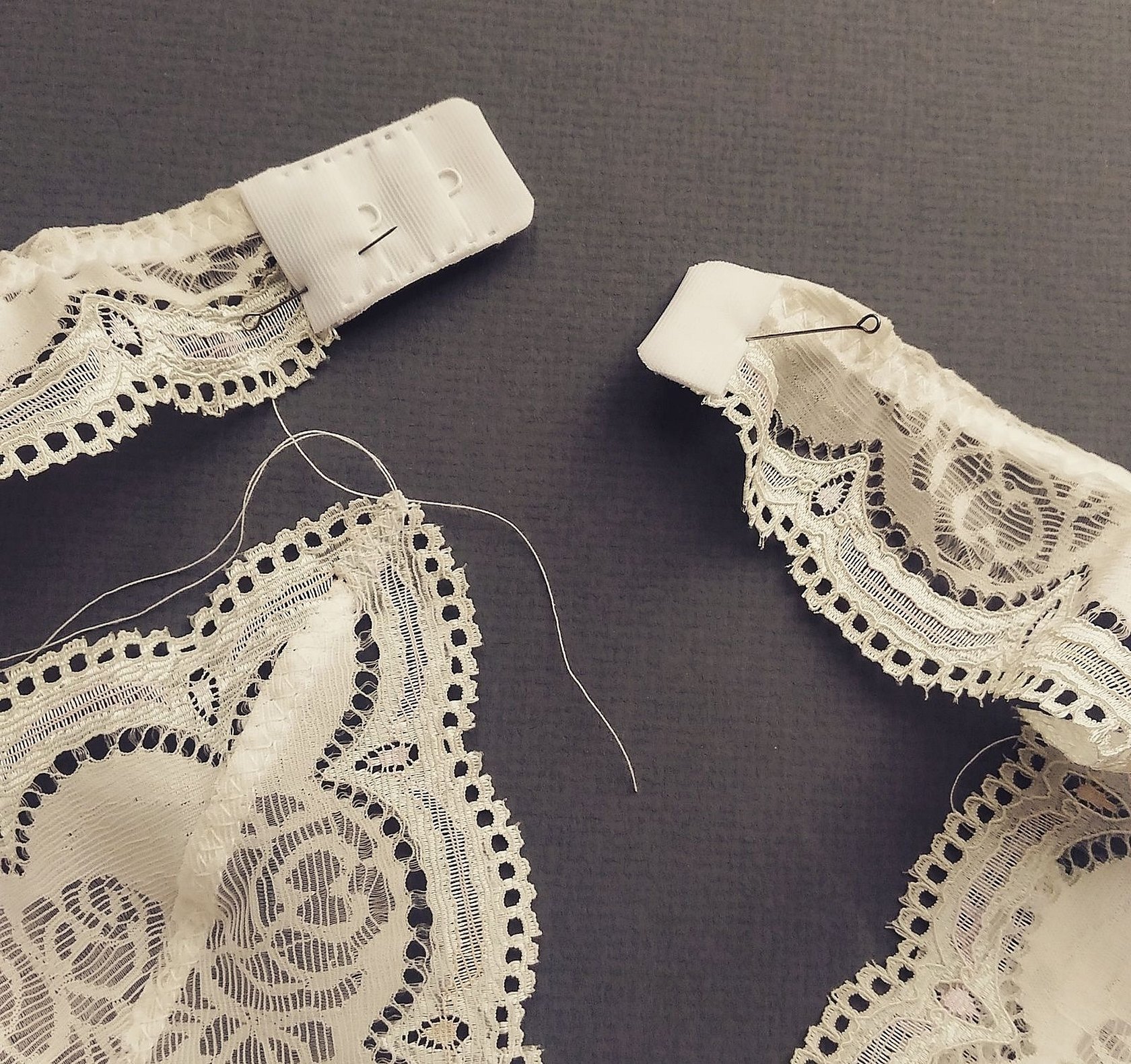 - Обшивание широкой резинки кружевами и подшитие ее к чашечкам;