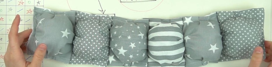Сначала у каждой подушечки нужно прошить три края, после добавить наполнитель и закрыть четвертым швом. Таким образом нужно поступить с каждым элементом. Когда заготовки сделаны, их надо соединить в полоски