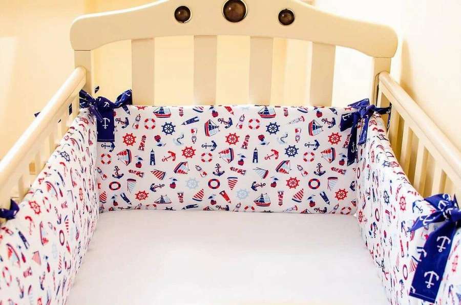 К примеру, из ткани с таким типичным морским принтом получатся чудесные мягкие бортики в детскую кроватку своими руками. Главное – натуральность и гипоаллергенность материала!