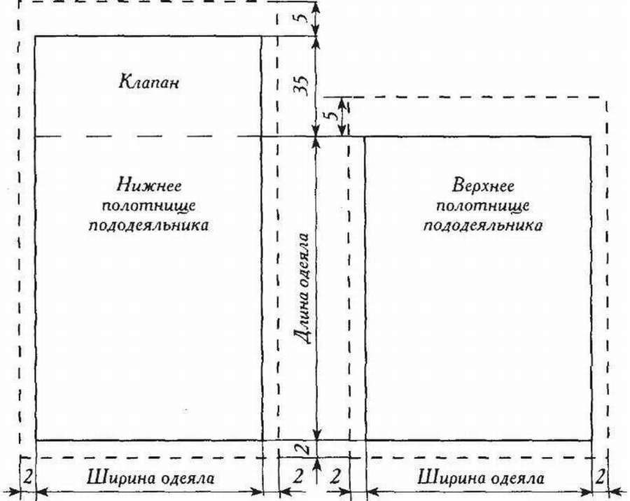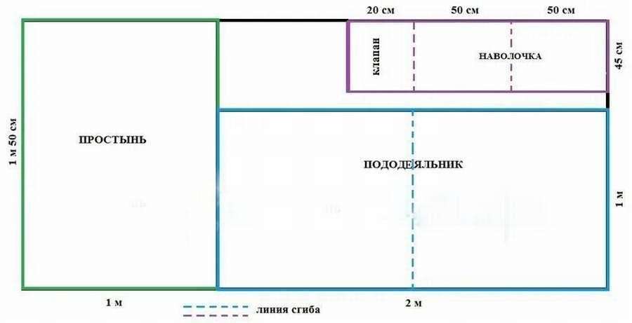 - Пододеяльник – сырье рассчитывается, исходя из размеров одеяла, под которое он, собственно, шьется. Получается: для одеяла 1,2м вам потребуется – две ширины + 10 см припуск + 10 см на усадку + 10 см, чтобы одеялу было свободно = 2м 70 см + 10 см швы.