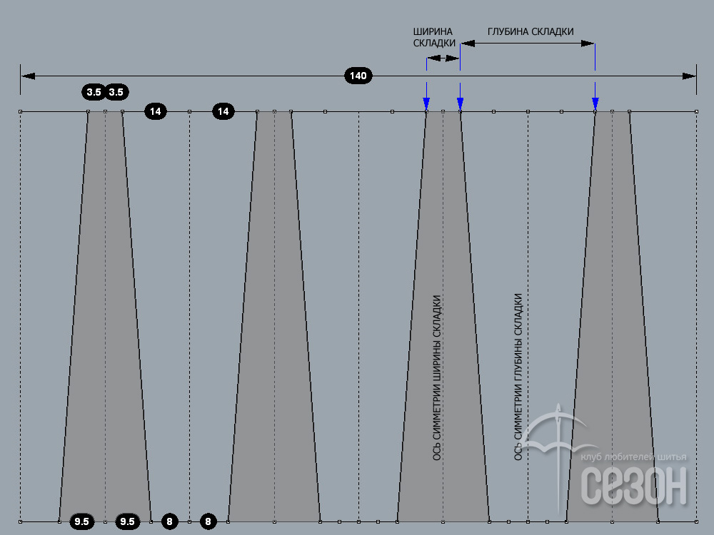 Размеры на выкройке следует откладывать от осей симметрии, ширина складочки 3,5 + 3,5 = 7, углублённость – 14 + 14 = 28.