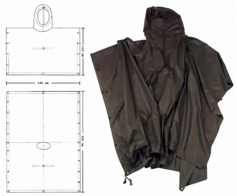 Плащ из непромокаемой синтетической ткани может использоваться как дождевик, пончо, тент и даже заменить палатку и стать укрытием для стоянки. Вшить капюшон в центральную часть прямоугольного полотна вряд ли окажется для кого-то непреодолимой задачей.