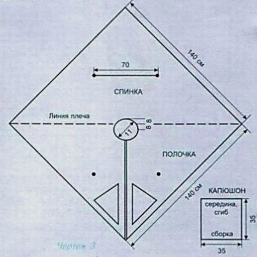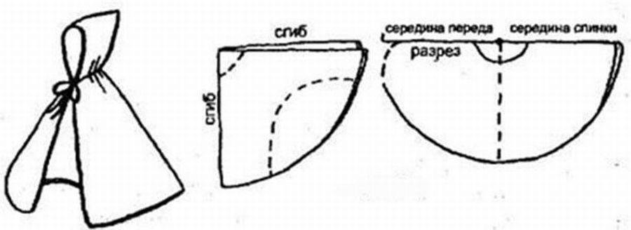 Ткань складывают по диагонали и строят на ней полукруг. Его радиус должен быть равен длине руки. Затем выкраивается горловина и делается разрез спереди.