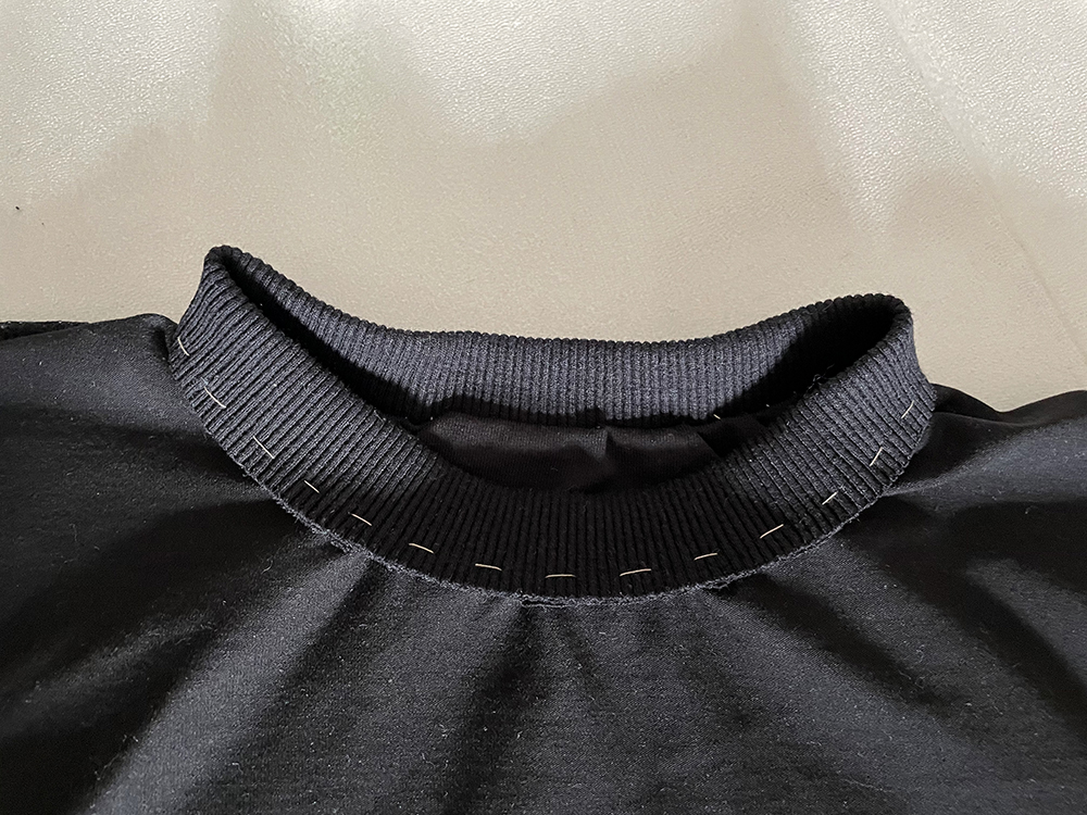 Бейку вметайте в горловину. Длина бейки меньше, чем длина горловины, поэтому ее нужно слегка растягивать.
