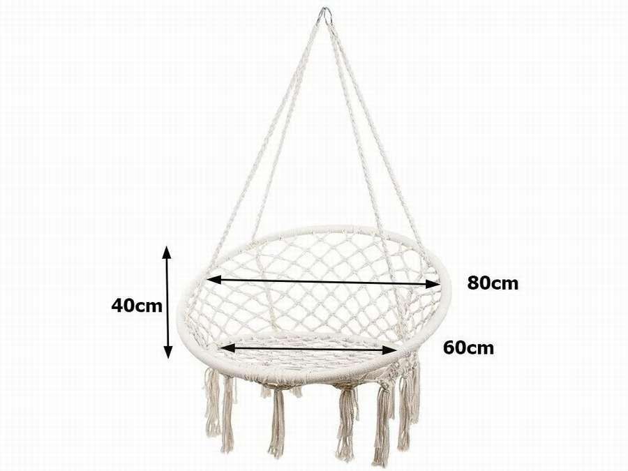 Красивый круглый гамак, основа которого два обруча из прочного материала. Низ сплетен одним узором из шнуров, а спинки – другим, тоже ажурным. Подвешивается такой гамак на прочные шнуры.