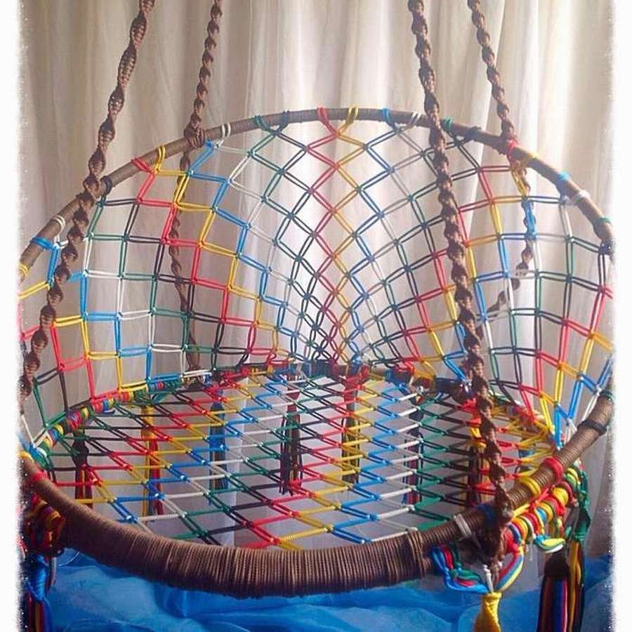 Красиво и оригинально смотрится сплетенный из цветных шнуров круглый гамак, основой которого являются все те же обручи из прочного материала, а узор для плетения можно выбрать самый простой, главное, чтобы он прочно держал форму.