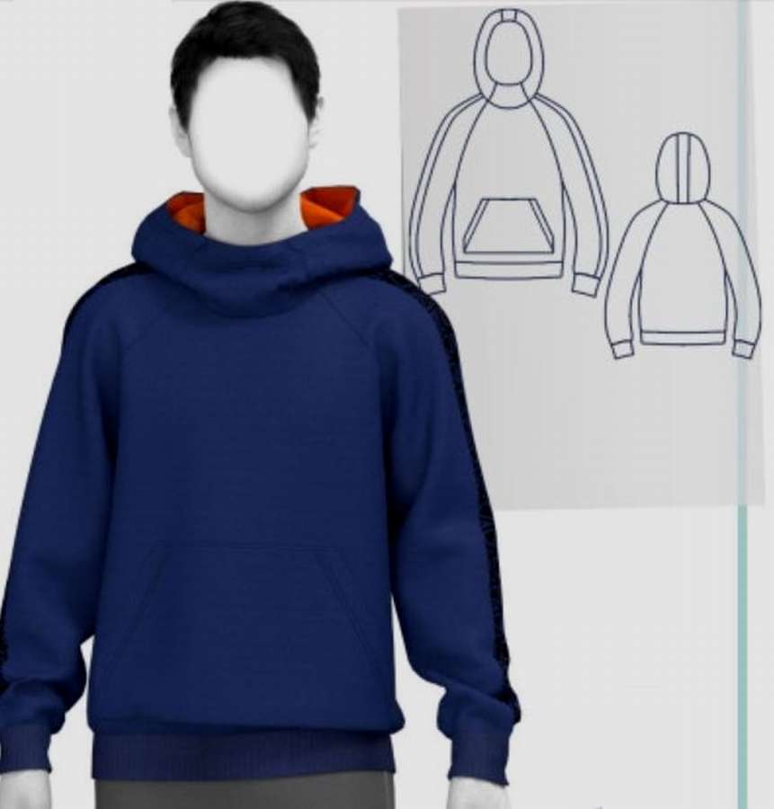 Мужская толстовка с капюшоном фасона реглан и ее технический рисунок.