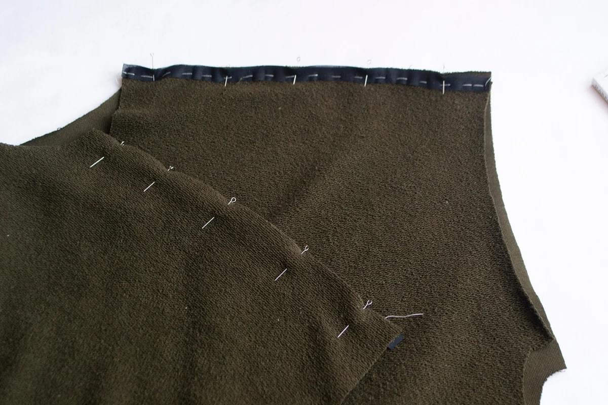 На детали переда проклейте плечевые срезы долевой нитепрошивной кромкой или приметайте специальную укрепляющую силиконовую тесьму. Это нужно, чтобы плечевой шов не деформировался и не растянулся при носке и после стирки.