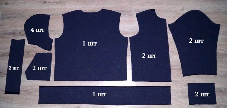 Выкроенные детали толстовки из футера. Манжеты и пояс автор рекомендует делать из рибаны или кашкорсе, хотя здесь использован футер с лайкрой.