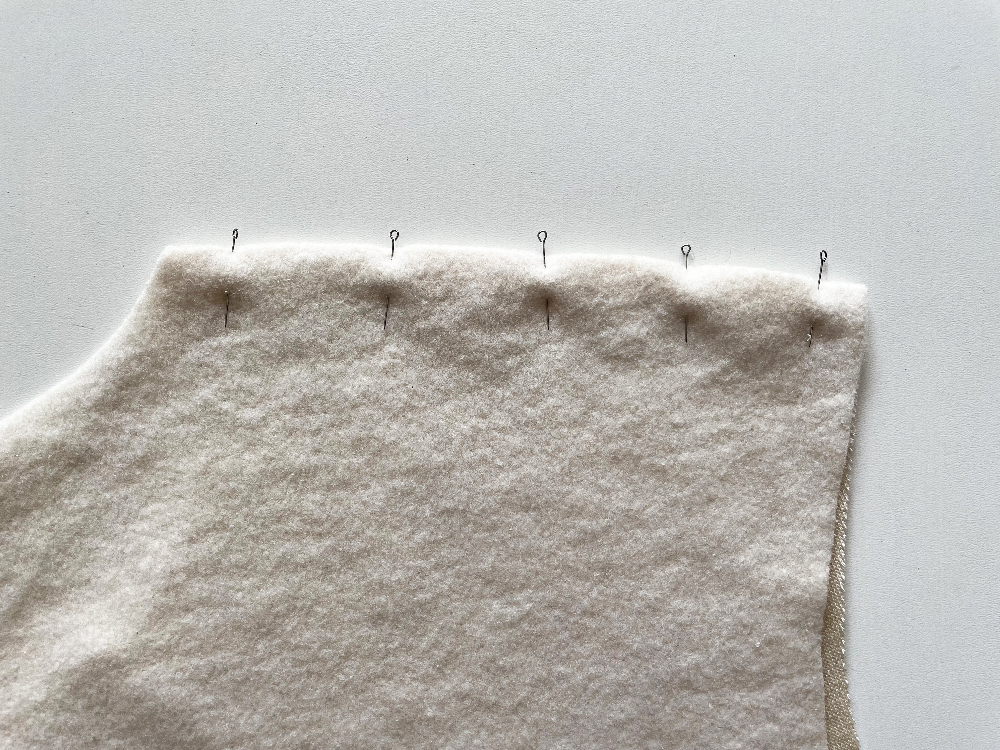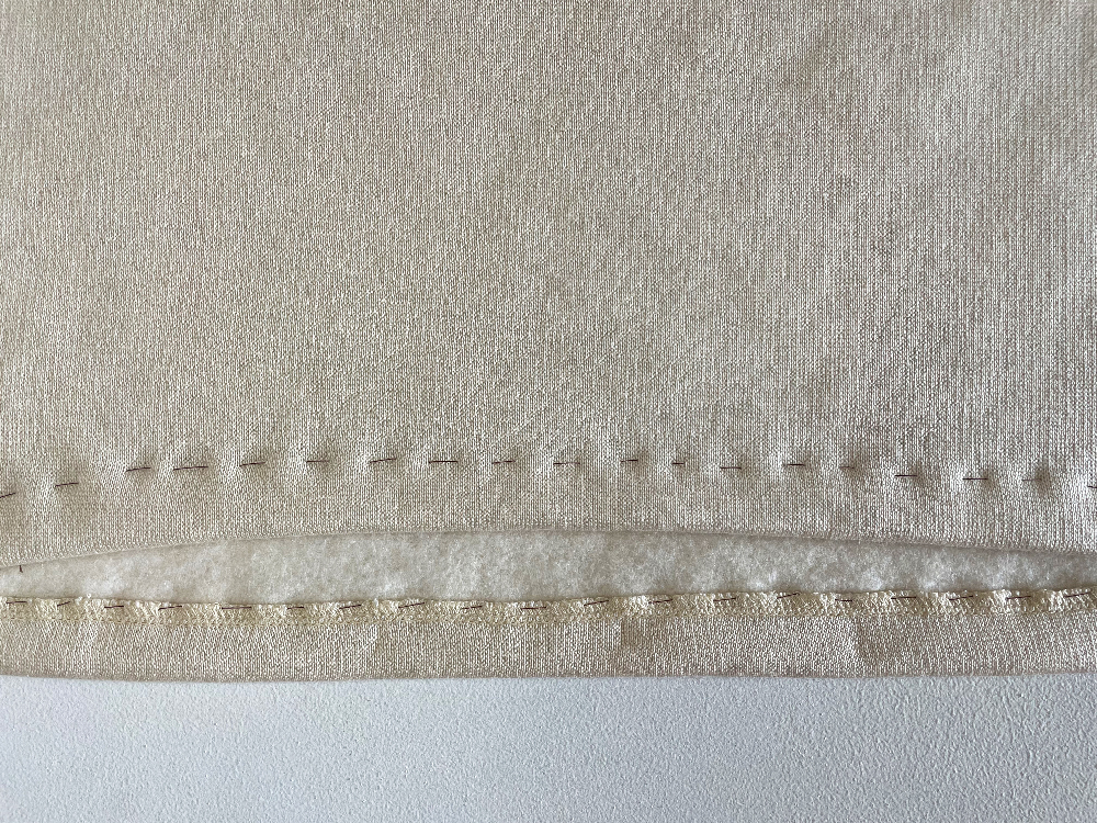 - Когда горловина обтачана, заутюженные при помощи шаблонов срезы, просто накладываются и намётываются большими косыми стежками, после чего их можно подшить потайными стежками или декоративно-закрепляющей сточкой.