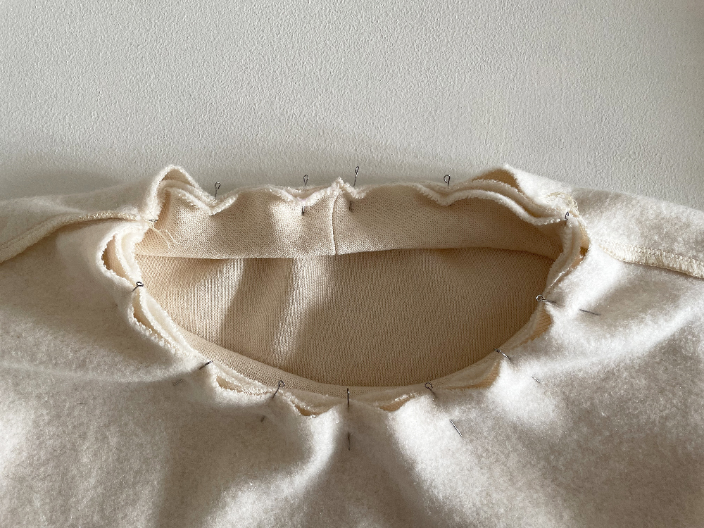 - Когда заутюживание выполнено, можно обтачать горловину.