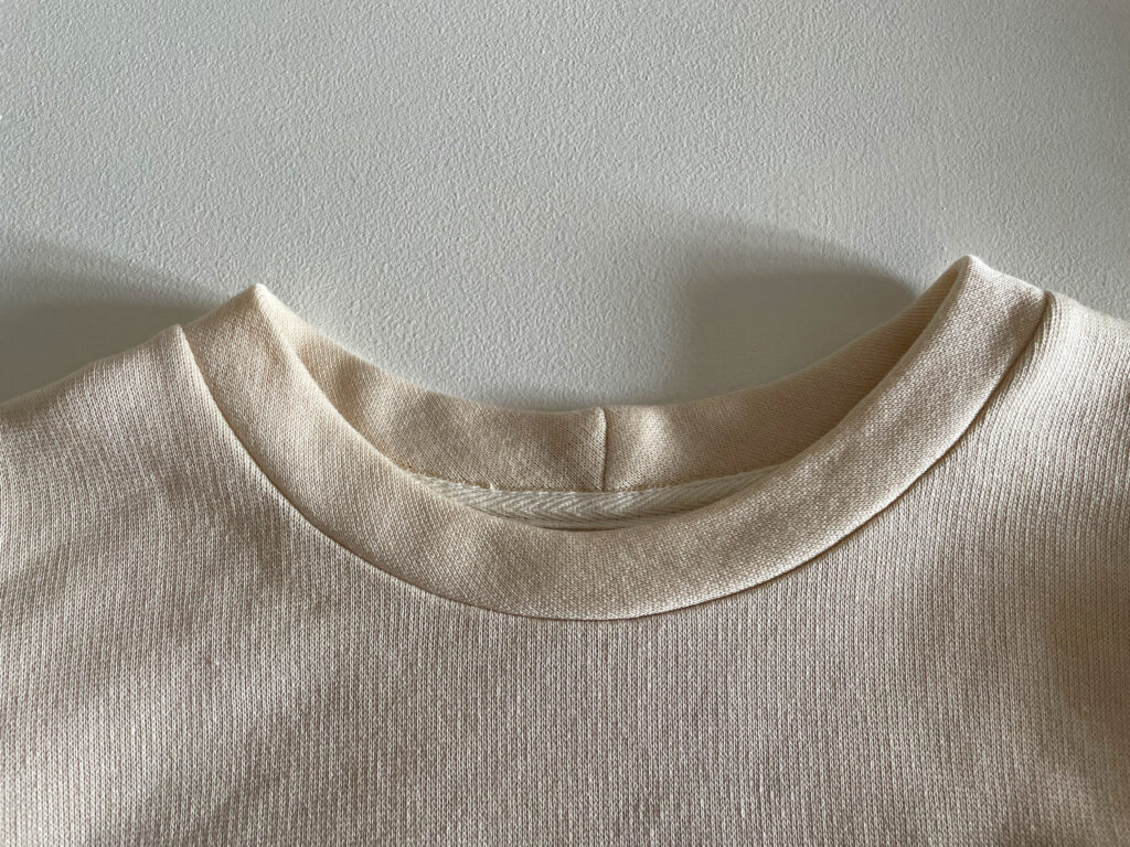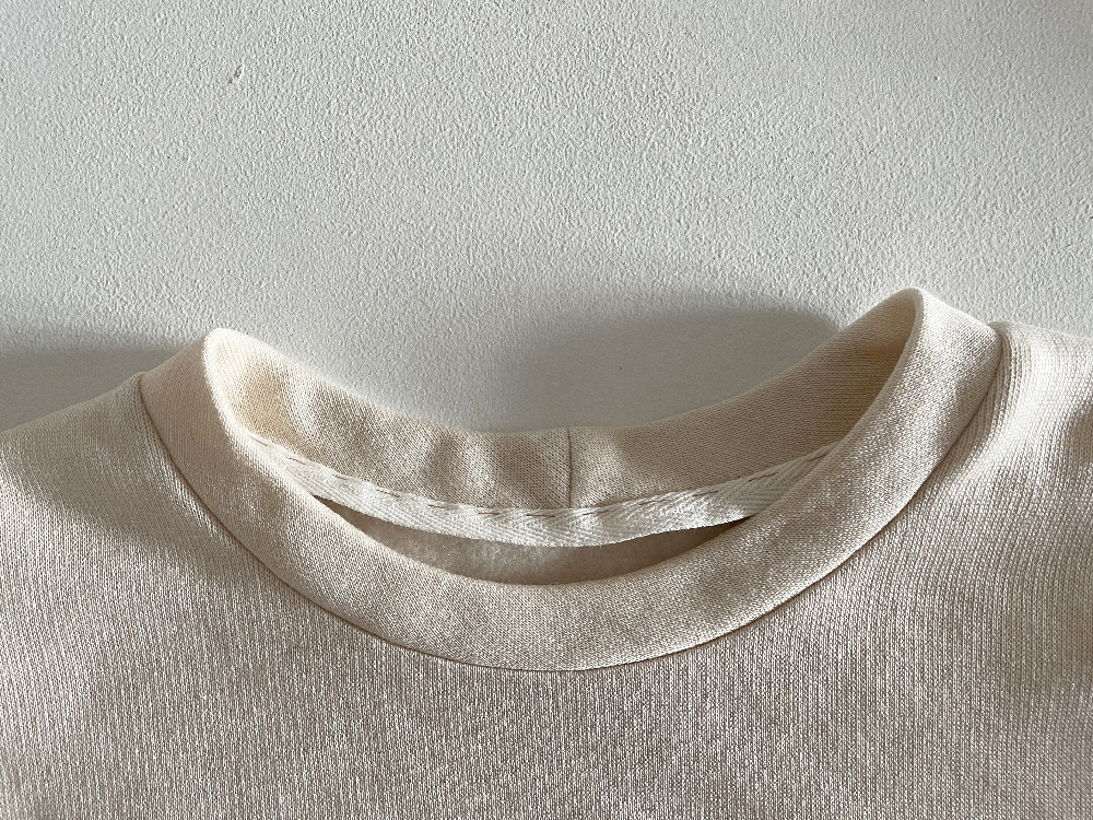 - Вам следует стачать, обметать и заутюжить один плечевой шов, окантовать горловину.