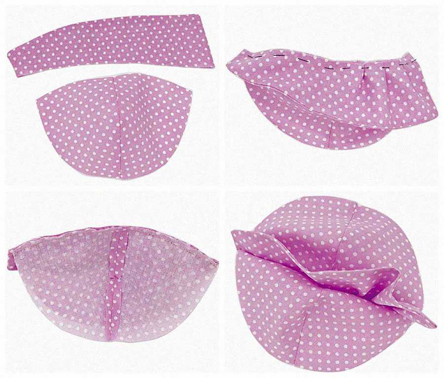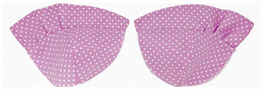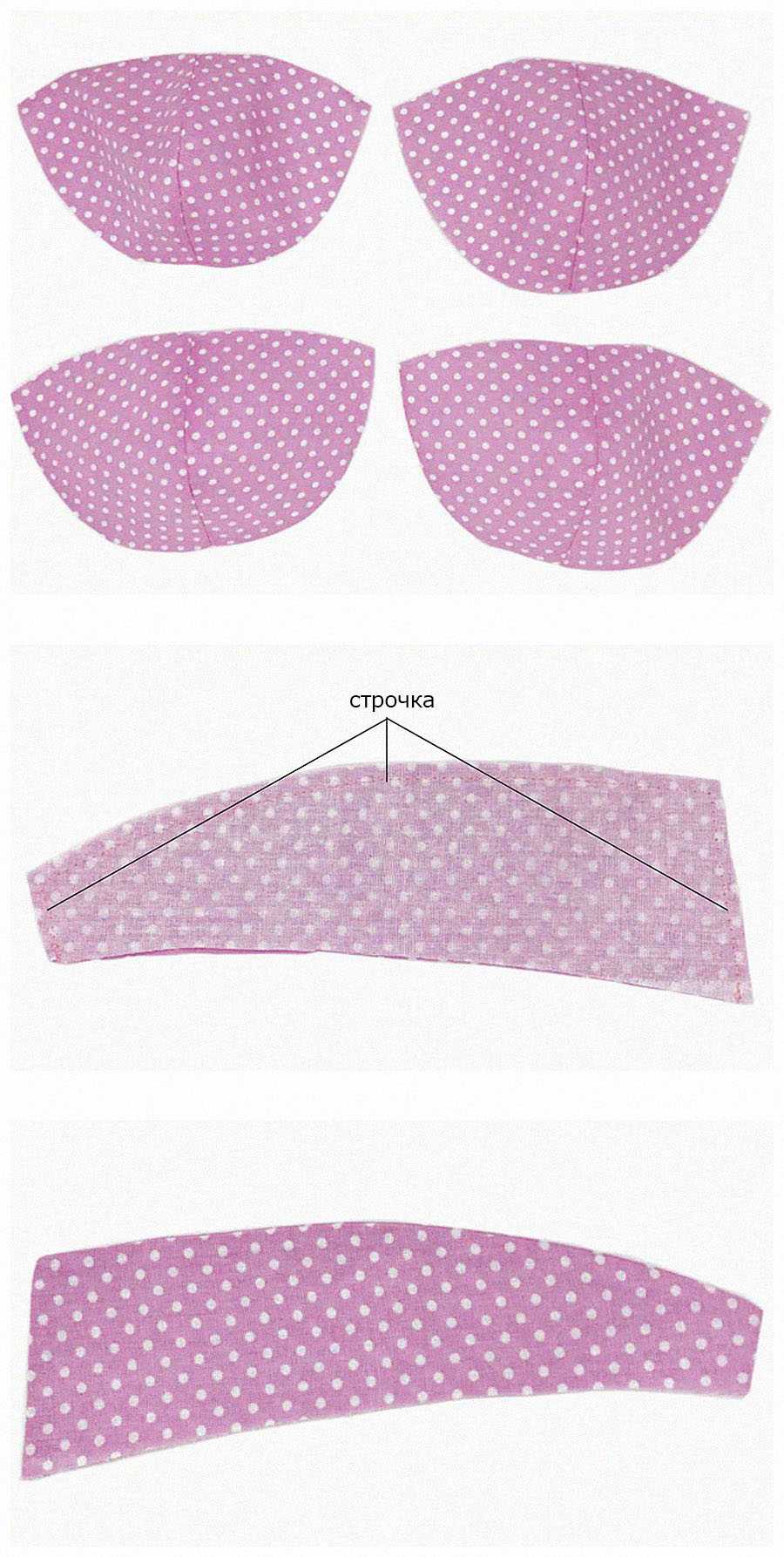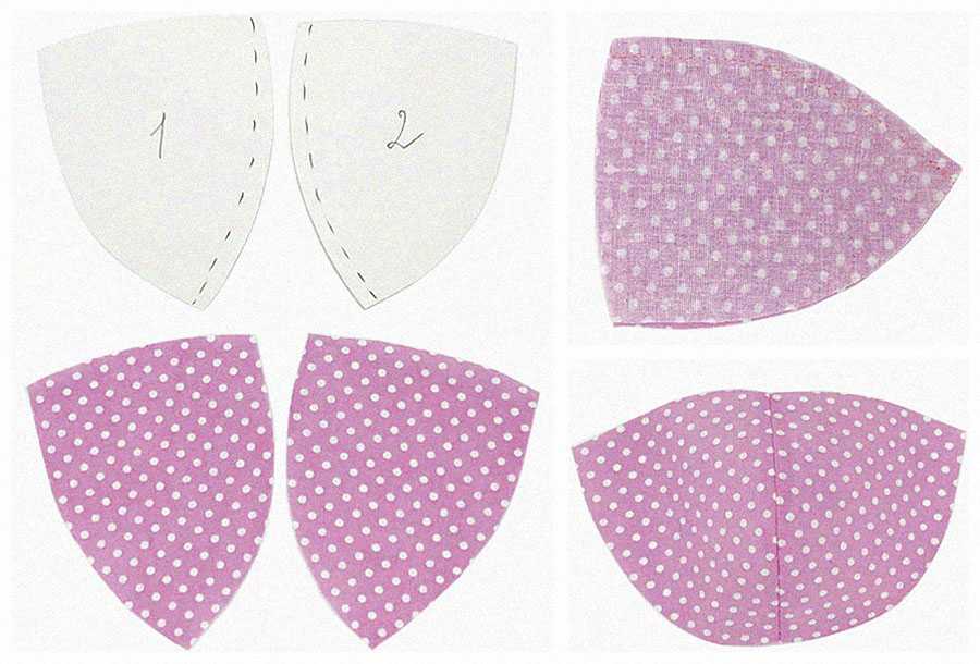 Таким же образом сшейте и разутюжьте остальные три пары деталей. Возьмите пару деталей № 3 (верхняя часть чашек), сложите их лицевыми сторонами внутрь и сострочите прямой строчкой с трёх сторон: двум коротким и одной выпуклой. Выверните сшитую деталь на лицевую сторону и проутюжьте. Аналогично обработайте вторую пару деталей № 3.