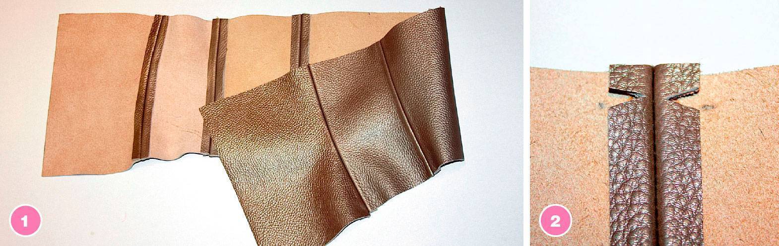 Настрочить кожаную ленту на соответствующие рельефы так, чтобы остались открытые участки (шлевки) длиной по 2 см каждый: один посередине рельефа, два других – отступая от среднего на 2 см вверх и вниз (4, 5).