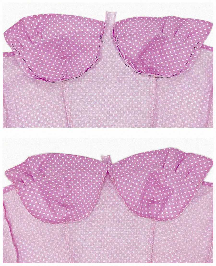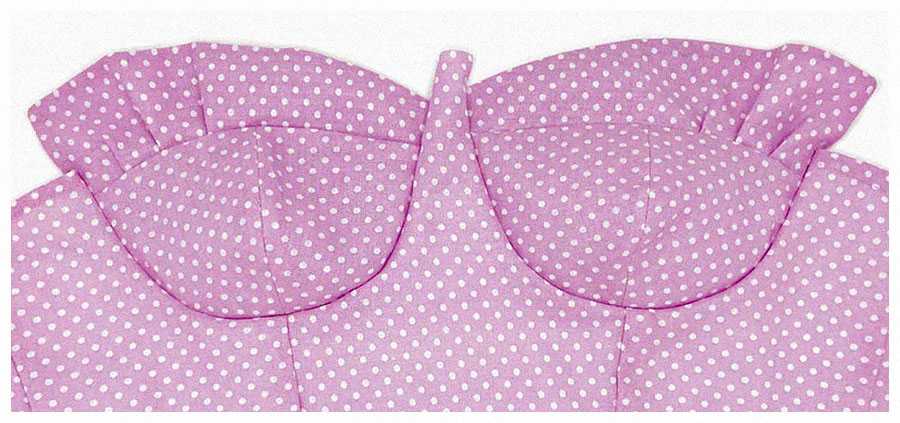 Приметайте чашки к поясу контрастными нитками, приложив их так, чтобы широкие края рюша были ближе к боковым швам. Рюш при этом выступает за края пояса. Пристрочите чашки к поясу прямой строчкой и обработайте шов строчкой «зигзаг».