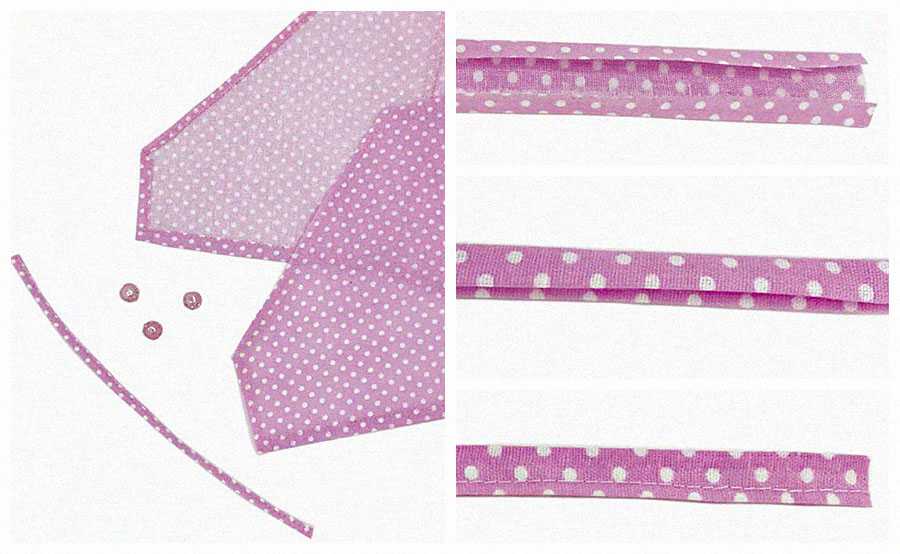 Теперь делаем застёжку. Нам понадобятся три пуговицы и узкий шнурок из той же ткани, что и корсаж.