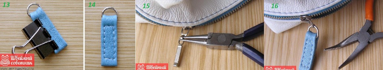 Вставляем в кольцо оставшуюся деталь из голубой кожи и склеиваем, прижав прищепкой. Отстрачиваем по краям – см. фото. Заменяем подвеску на молнии на кольцо с хлястиком. косметичка из кожи готова!