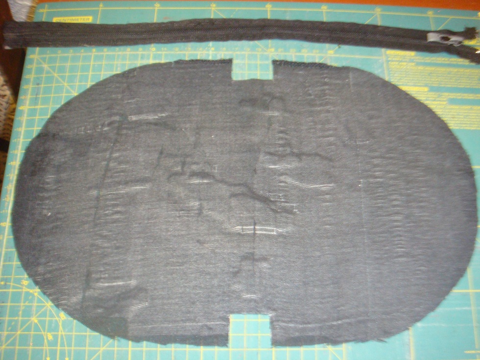 Далее пришивается вторая часть молнии. Она должна немного свисать, поэтому ее край должен быть немного длиннее. Молнию сзади нужно зафиксировать булавками и между основой и подкладкой. Ее конец нужно зафиксировать на основе и немного уходить в середину между подкладкой и основой.