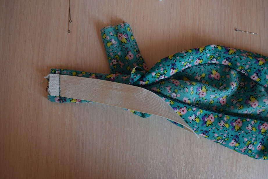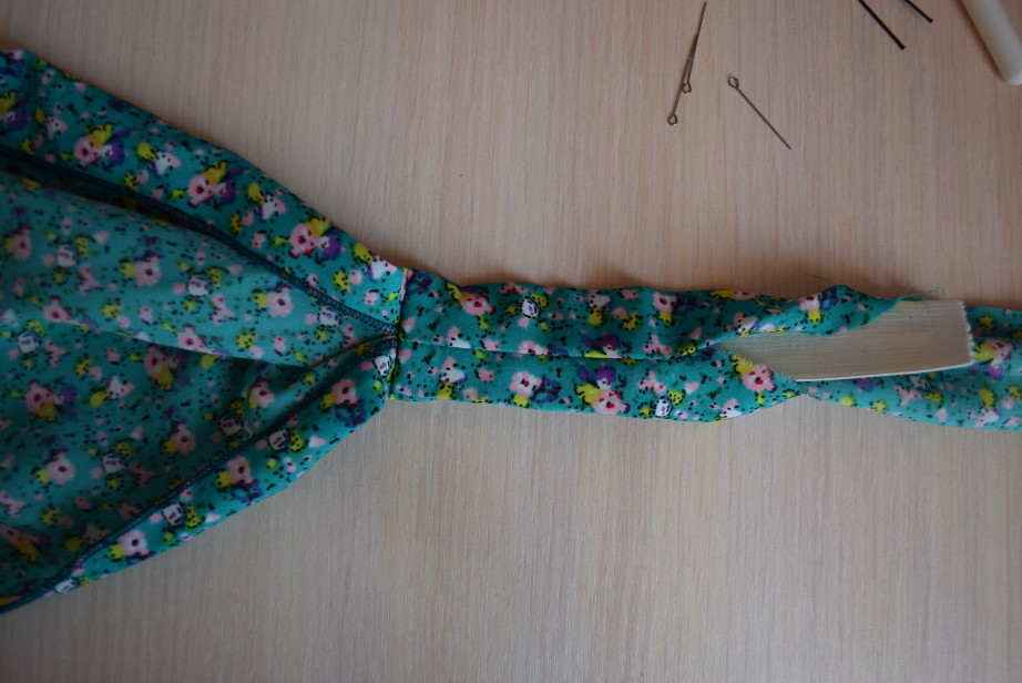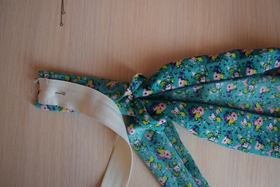 Внутрь полученной заготовки вставляем резинку, под ее размер присобираем ткань. Края резинки и ткани временно скрепляем булавками.