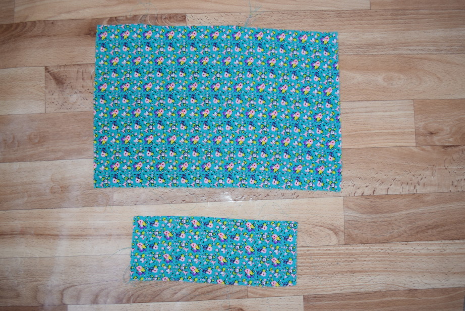 Из хлопковой ткани необходимо вырезать два кусочка. Лоскут 26х38 см будет использоваться для пошива основной части косынки, а кусок 6х40 см пойдет на изготовление перемычки с резинкой.