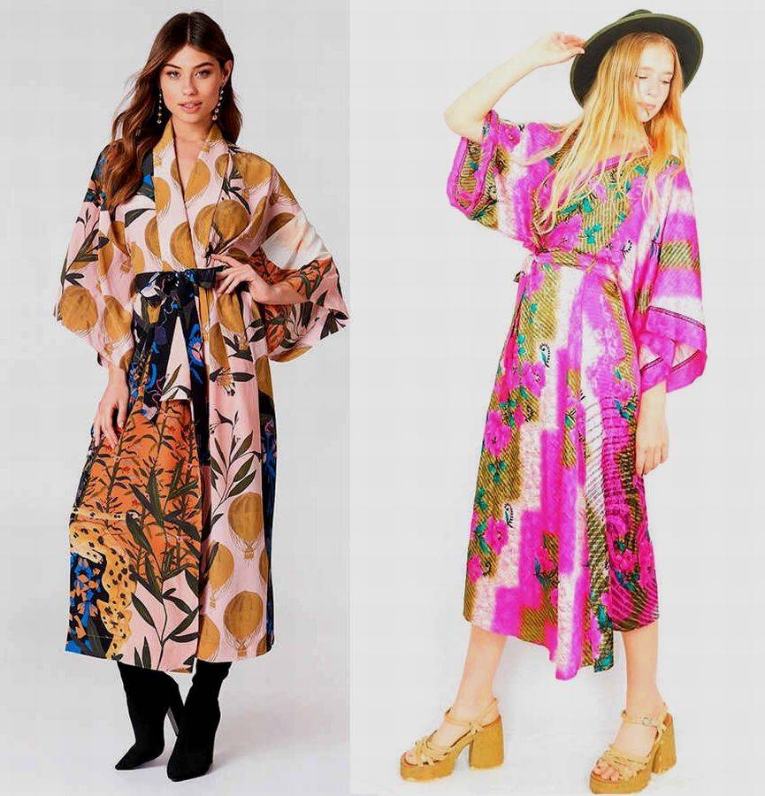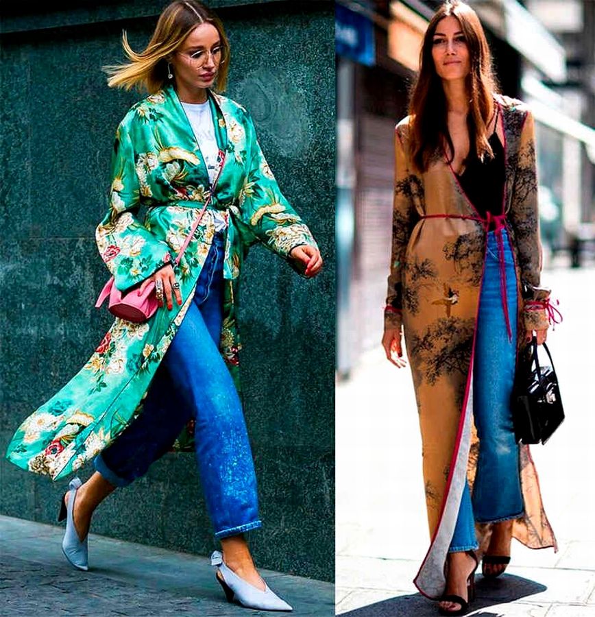 А вот уже кимоно сугубо европейского стиля, то есть это просто платье фасона кимоно из легкой ткани соответствующей расцветки. Вполне допустимо в комплекте с брюками, но стилисты не советуют увлекаться украшениями, поскольку ткань и так достаточно богато расписанная.