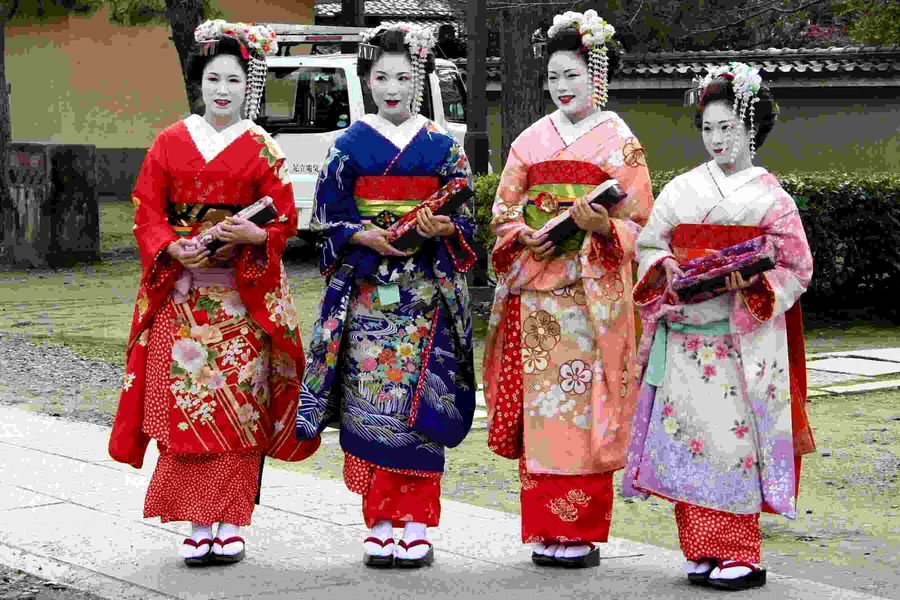 Халаты в японском стиле кимоно могут быть самыми различными. Здесь виден, скорее, стиль юката, то есть халаты сшиты из легкой ткани, разная длина, обувь может быть, какой угодно или вовсе отсутствовать. Единственное правило, верное для японского стиля вообще – запах всегда делается слева направо, независимо от пола.