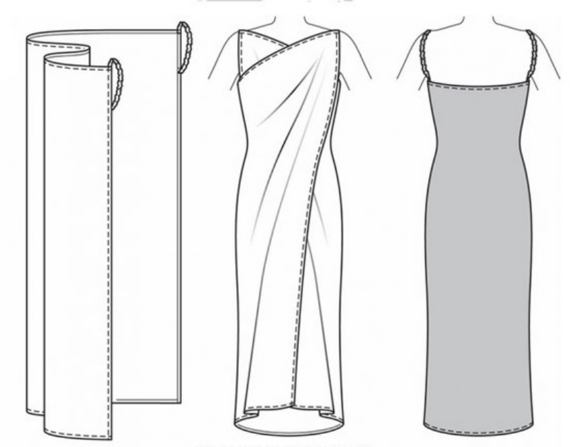 Для пошива платья на пышную фигуру нужно подготовить отрез ткани прямоугольной формы и ажурные ленты в тон ткани для бретелей. Определившись с длиной платья, обработайте края отреза со всех сторон. На краях, вверху пришейте бретели (на схеме ниже хорошо видно, как должно выглядеть платье без швов). Теперь осталось дело за малым – надеть платье. По необходимости поверх можно повязать пояс.