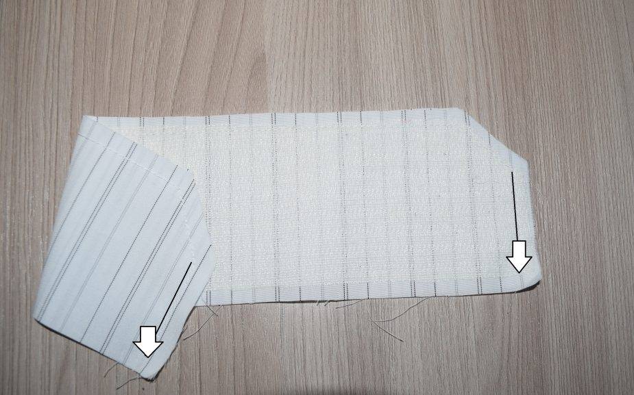 10.Накладываю выкройки манжет лицевыми сторонами внутрь друг другу или как говорят на портновском сленге «лицом к лицу». Сшиваю отступая от края на 1 см. При этом не довожу строчку до края на 1 см., как показано стрелками на фото.