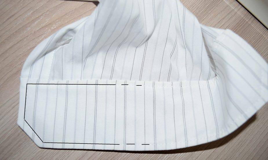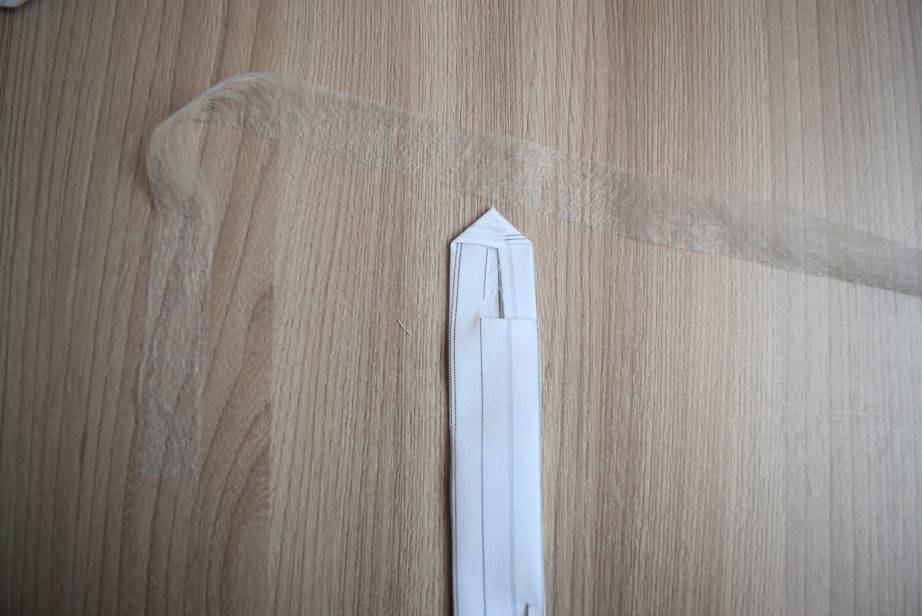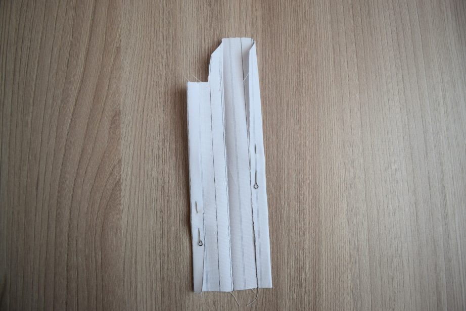 Теперь всю конструкцию переворачиваем на лицевую сторону и продолжаем работать с узкой обтачкой. Обернуть припуск, подвернуть обтачку.