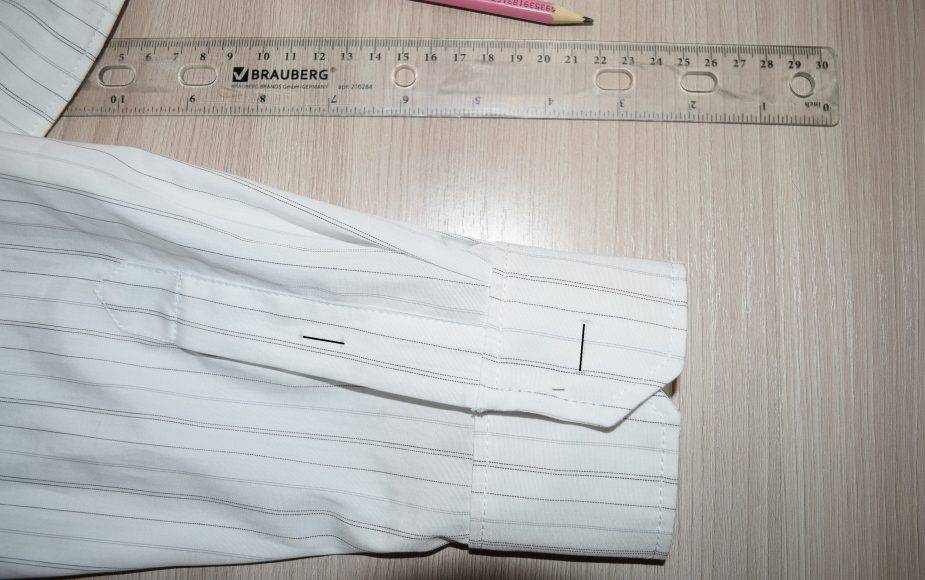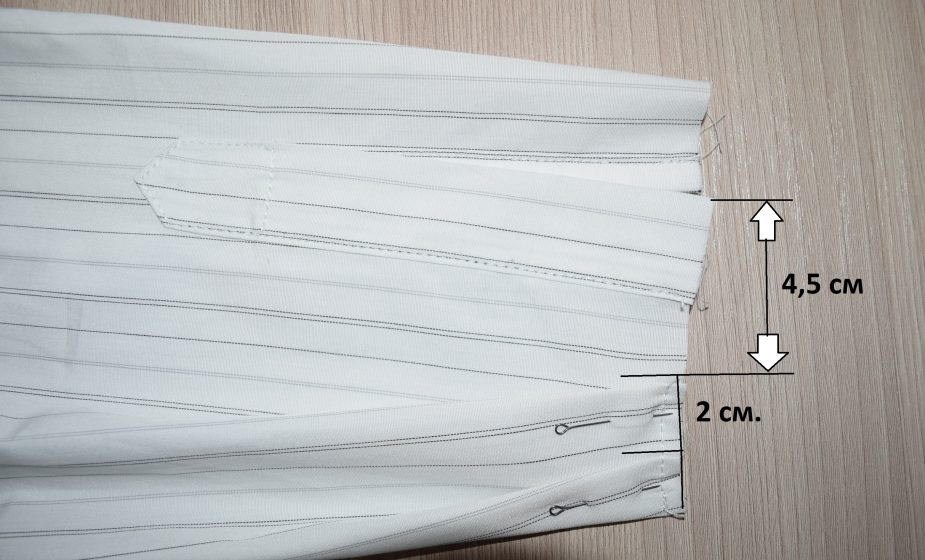 Отмерьте, на каком уровне будет пришиваться к рукаву манжета. Деталь представляет собой прямоугольник, ширина которого равна ширине манжеты, а длина – это уровень пришивания манжеты (вы его только что отмерили) плюс 2 см.