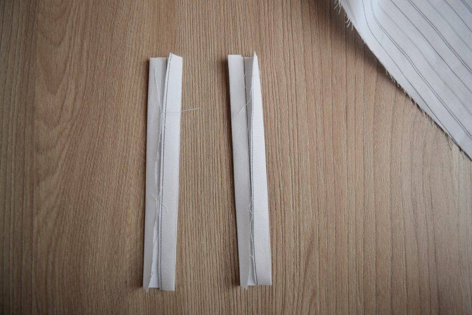 6.Готовлю обтачку для шлицы рукава с манжетами. Сначала заутюживаю её согнув пополам.