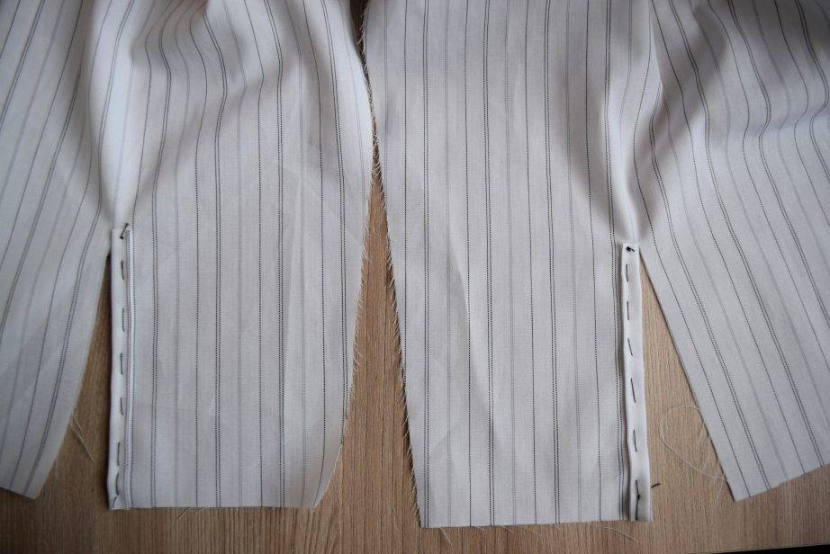 Но так как мы не китайские рабочие с конвейера, то, скорее всего, наш навык выполнения этого узла не доведен до автоматизма, да и качество хотим не китайское, то стоит взять иглу с ниткой и сметать детали по намеченным линиям. Я тщательно совмещаю края деталей и дополнительно делаю точечную закрепку нитками в тон рубашке – на пару миллиметров, — теперь у меня есть полная уверенность, что края не сдвинутся во время машинной операции. Портные дорогих мужских ателье эту операцию делают вручную.Притачать точно по намеченной линии. Отутюжить.