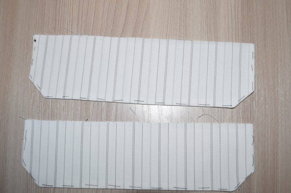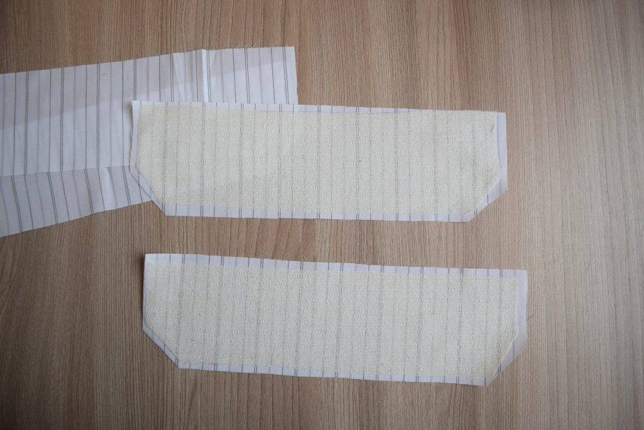 9. Приступаю к обработке манжет. Усиливаю жесткость манжет, проклеивая две детали клеевой тканью с изнаночной стороны. Края на припуски не проклеиваются, т.е от края оставляю по 1 см.