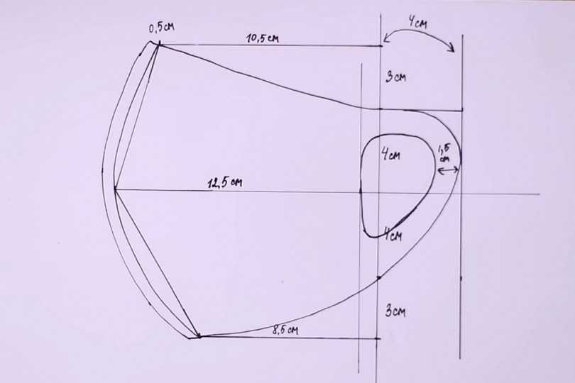 По короткой стороне из верхнего левого угла отмерьте 2,5 см, а из нижнего — 4 см. Первая точка — для носа, вторая — для подбородка. Соедините все точки прямыми линиями. Скруглите на 0,5 см линии, идущие к центру. Сверху сделайте прогиб на 1 см. Вырежьте полученную выкройку.