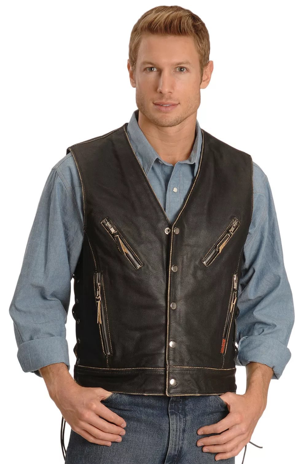 - байкерский жилет – элемент имиджа. Его шьют из джинса или кожи, украшают металлическими заклепками и нашивками.