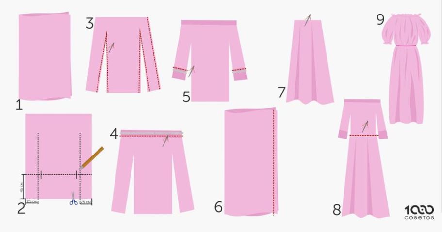 Подбираем нужную ткань, складываем вдвое. Размечаем, как показано на рисунке. Выполняем боковые швы. На талии делаем кулиску. В неё вставляем ленту или резинку. Предлагаем посмотреть видео Юлии на канале “Платье – терапия». В нём она расскажет, как сшить платье без выкройки на кулиске.
