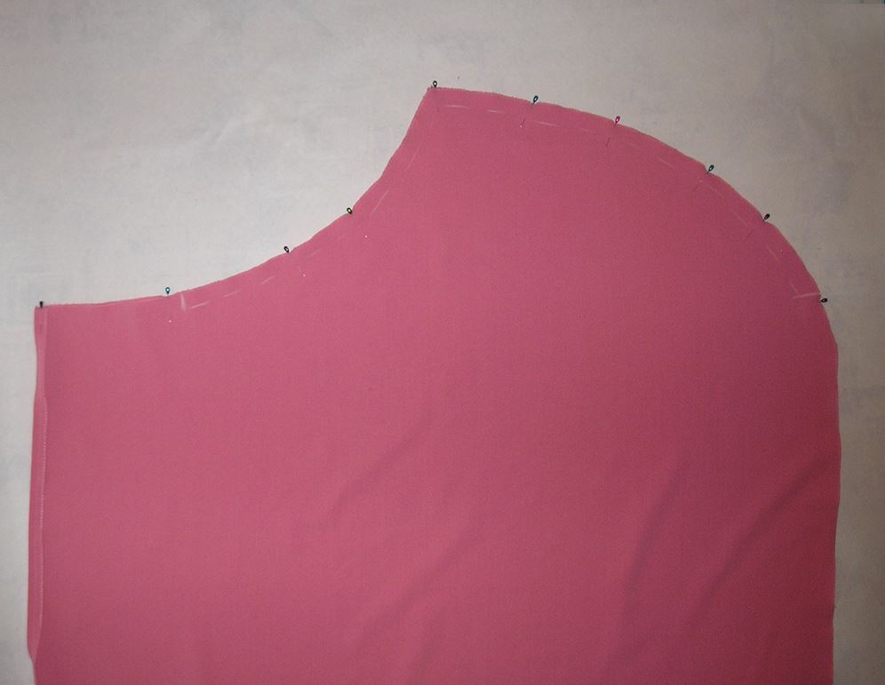 Обмётываем срезы деталей спинки и переда. Складываем части платья лицевыми сторонами друг к другу, прострачиваем плечевые швы, разутюживаем припуски. По горловине выполняем подворот на изнаночную сторону, приутюживаем.
