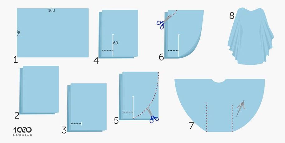 Далее проведите вертикаль на высоту 0,6 м. Разверните ткань в два слоя и выполните два боковых шва на указанную высоту. Плавной линией скруглите угол. Срежьте лишнюю ткань. Прочертите горловину 4 на 40 см. Обработайте срезы. Платье готово!