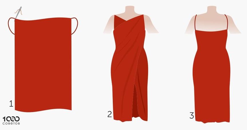 Нам потребуется большой отрез ткани. Его размеры зависят от длины будущего платья и объёма ваших бёдер. Ткани для такой модели лучше выбирать лёгкие, пластичные. Пошив выполнить очень просто. Необходимо обметать срезы, изготовить и пришить бретельки. Осталось обернуть материю вокруг тела (см. рисунок) и продеть руки в бретели. Самое простое платье без швов готово! Можно добавить к нему поясок.