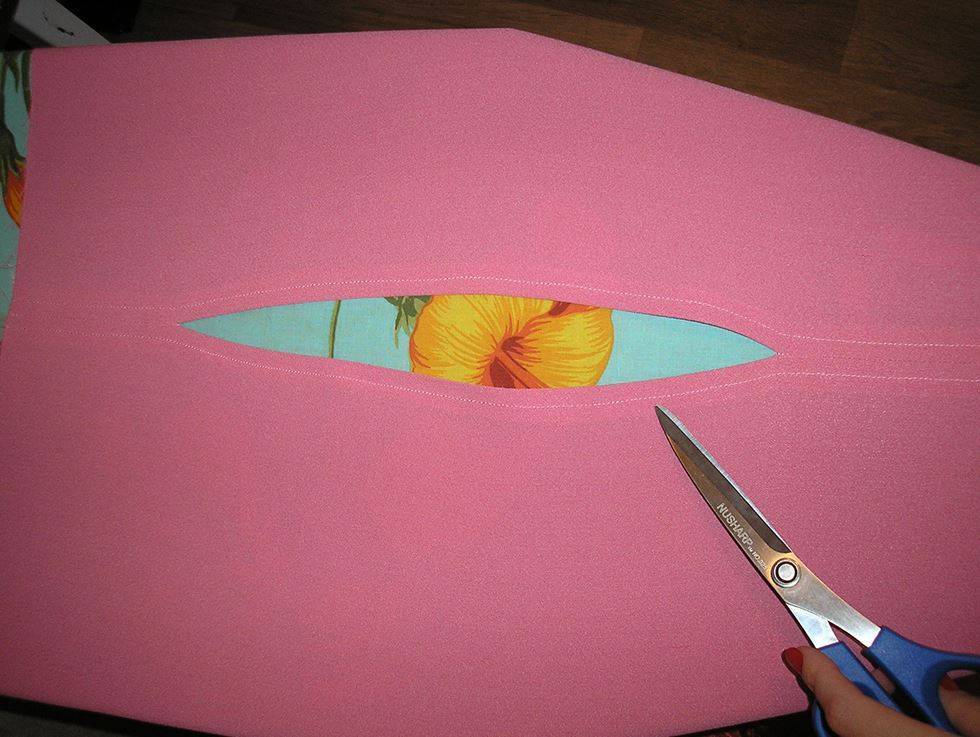 - В центре прямоугольника делаем надрез на глубину декольте: 5-10 см.