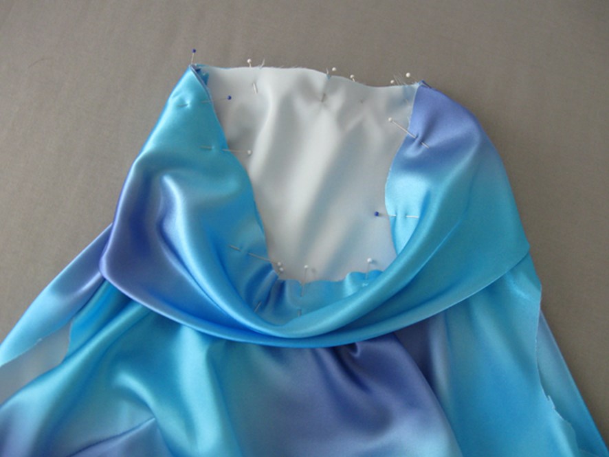 Теперь очень внимательно! Располагаем спинку лифа платья на столе лицом вверх и горловиной к себе. Перед платья должен полностью находиться на спинке. Обтачку горловины спинки (изнанкой вверх) примётываем к плечевым швам. Закрепляем машинной строчкой обтачку к платью точно по строчке плечевого шва. Выворачиваем лиф на лицевую сторону, выправляя плечевой шов платья.