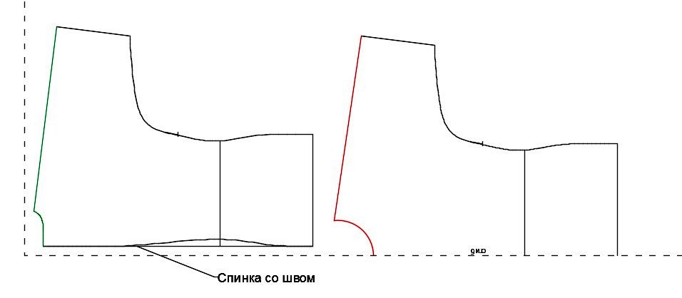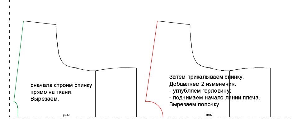 На следующем чертеже общие линии лекал показаны черным цветом, линии спинки – зелёным, линии полочки – красным.