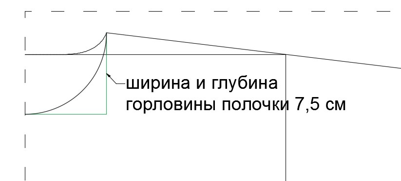 Пунктиром обозначим виртуальную ткань, сложенную в два слоя. Построение начинаем от линии сгиба, на расстоянии 4-5 см от верха.