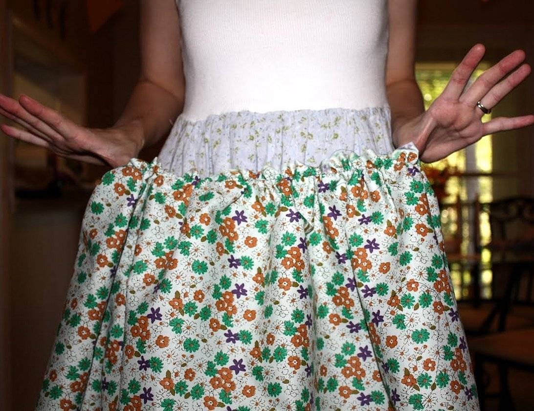 - Не затягивайте юбку сильно, чтобы не пришлось переделывать работу. Пусть лучше этот фрагмент будет просторным, а ширину вы подкорректируете, когда сошьете обе части вместе.