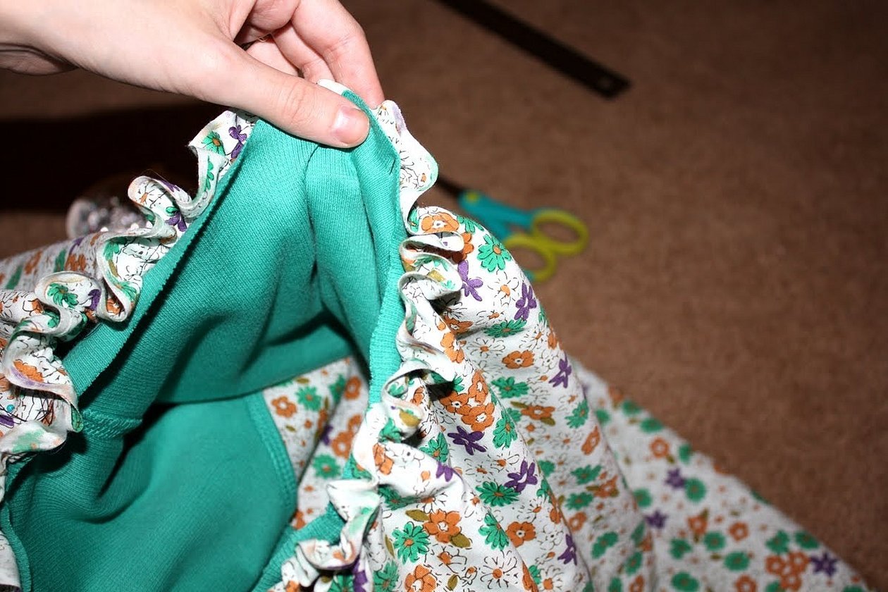 Есть маленькая хитрость для того, чтобы легко сделать сборки. Перед тем как прострачивать край немного затяните верхнюю нить на швейной машинке. Тогда ткань будет сама сбориться и надо будет только немного подправить, распределив складки более равномерно.