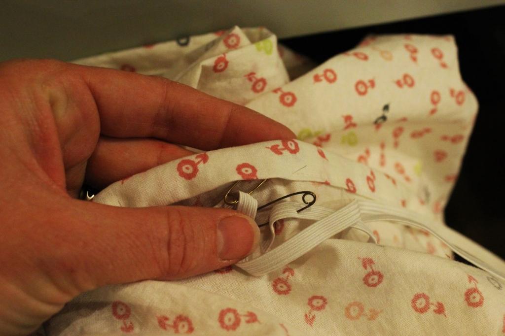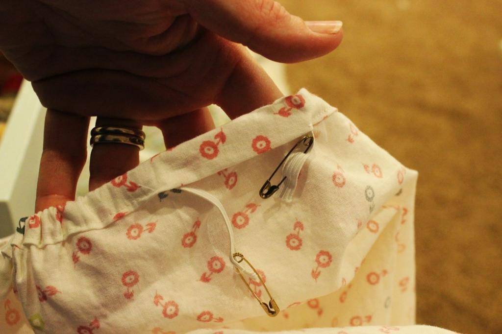 Если резинка не широкая, ее можно пропустить сквозь подгиб по всему периметру изделия. Для этого понадобится английская булавка.