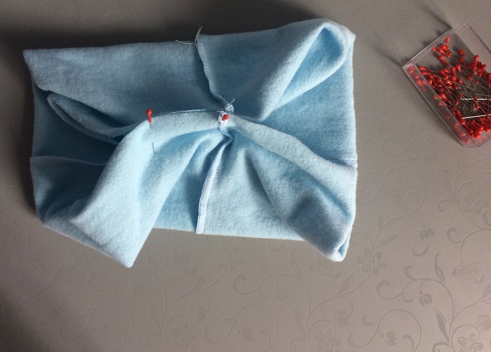 Сложить аксессуар в 2 слоя так, чтобы швы совпадали. Далее нужно определить, какая из сторон будет изнаночной, приколоть все булавками и прошить.