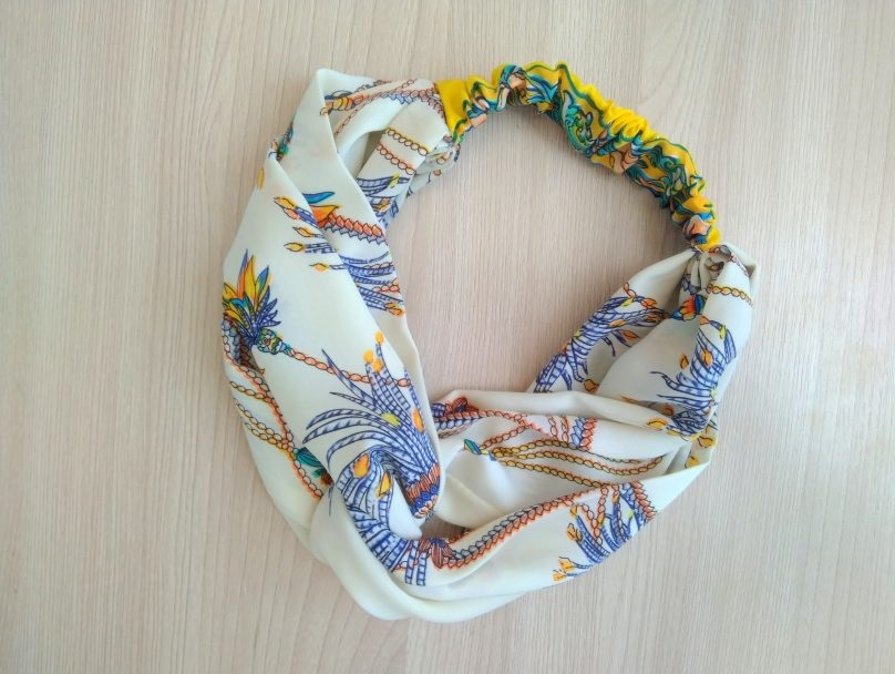 Такая косыночка – универсальный летний головной убор. Она не только прикроет голову от солнца, но и послужит украшением. Из повседневной косынки она может превратится в нарядную повязку благодаря двусторонним складочкам, которые легко подгибаются внутрь повязки.