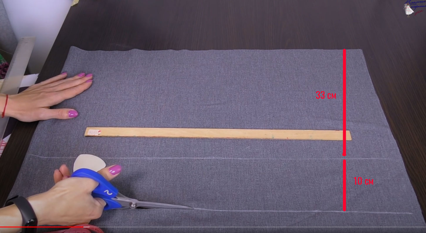 И заключительная часть — наша седалищная мерка 32 см, отмеряем 33 см (припуск 1 см), чертим линию и ниже на 10 см прибавляем длину от паха и отрезаем: